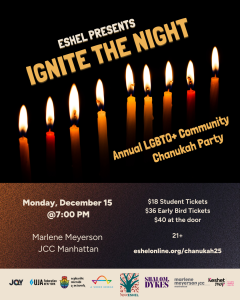 A Wider Bridge and Queers Against Antisemitism joins together with Eshel, JQY, UJA/NY, Sephardic Mizrahi Q Network, Shalom Dykes, Marlene Meyerson JCC, and Keshet for the Annual LGBTQ+ Chanukah Party! Celebrate Night Two of the Festival of Lights with the LGBTQ+ Jewish community of NYC! Enjoy a dairy dinner–complete with latkes, sufganiyot, and chocolate gelt–a wine bar, and DJ! We will eat, drink, dance, and have a special candle lighting ceremony. Let’s ignite the night together!