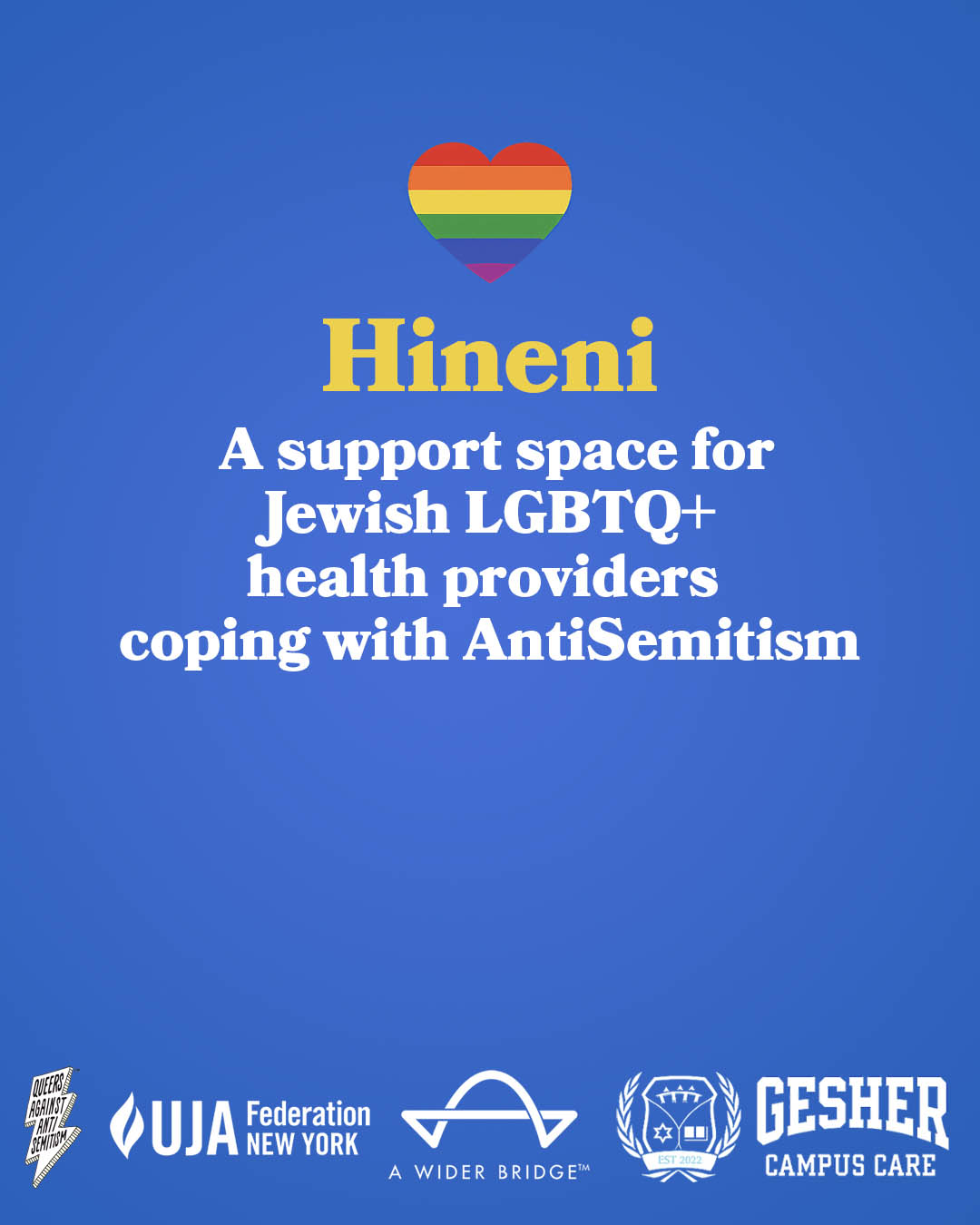 A Wider Bridge and Queers Against Antisemitism and Gesher Campus Care invite Jewish LGBTQ Health Care Providers to an Antisemitism LGBTQ+ Support group, providing a special safe space for our LGBTQ health care providers (therapists, social workers, doctors, nurses) to share, contemplate and support each other during these times where antisemitism is raging even within our own LGBTQ+ community. If you have experienced antisemitism in your practice either by colleagues and/or patients or in the workplace or are concerned about it in these times this is a group to gain strength and process together. This is not a group therapy session. This program is sponsored by a grant from UJA/NY.