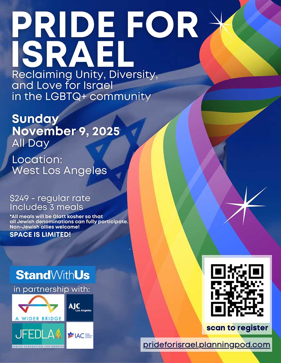 StandWithUs (SWU), in partnership with A Wider Bridge, the Jewish Federation of Los Angeles (JFED), the American Jewish Committee (AJC) Los Angeles, and the Israeli-American Council (IAC) is proud to announce the first-ever “Pride for Israel” conference in Los Angeles for the LGBTQ+ community. It will be held on Sunday November 9, 2025, beginning at 8:30am and running through 8:00pm.